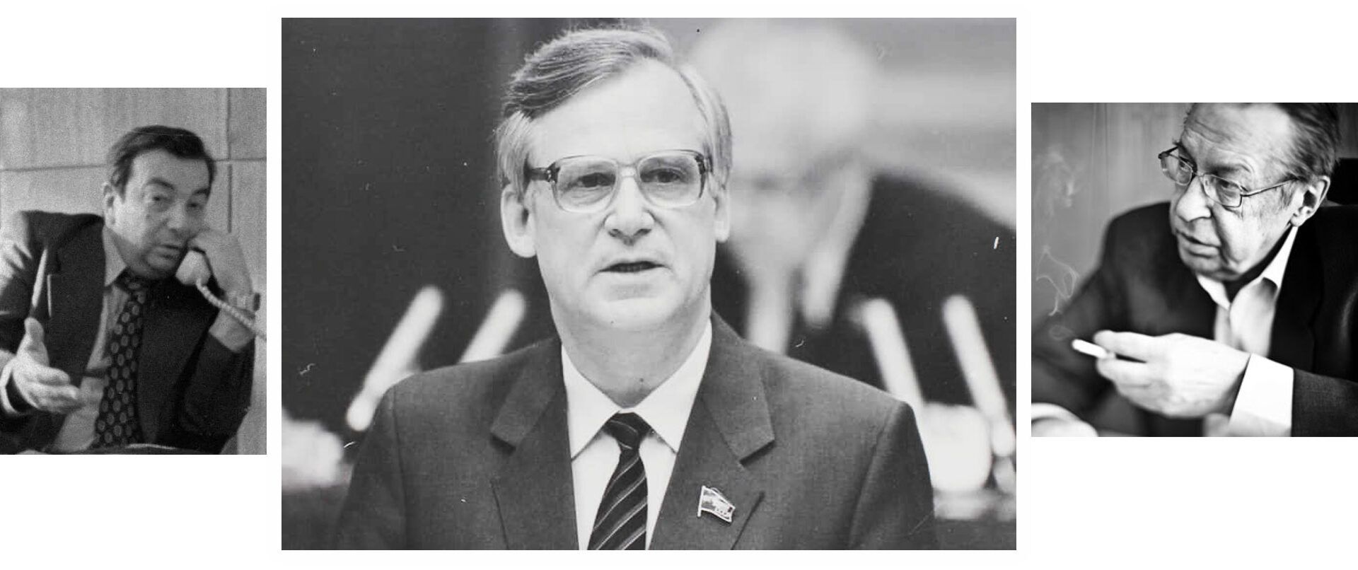 Иллюстрация: В центре: председатель Совета министров СССР (1985-1991) Николай Рыжков; слева: председатель Совета Союза Верховного Совета СССР (1989-1991) Евгений Примаков; справа: заместитель председателя Совета министров СССР (1989-1990) Леонид Абалкин