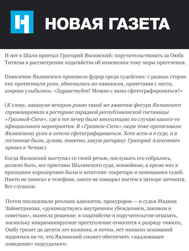 Так почему же это дело столь важно для каждого человека в России? Потому что в государстве-мафии, где суды полностью подчинены (а во многих случаях просто выполняют заказ), на месте Оюба Титиева с подброшенными в карман или машину наркотиками оказаться может любой. Поэтому дело каждого — распространять информацию об Оюбе, писать об этой вопиющей несправедливости, рассказывать об издевательствах над невинным человеком.