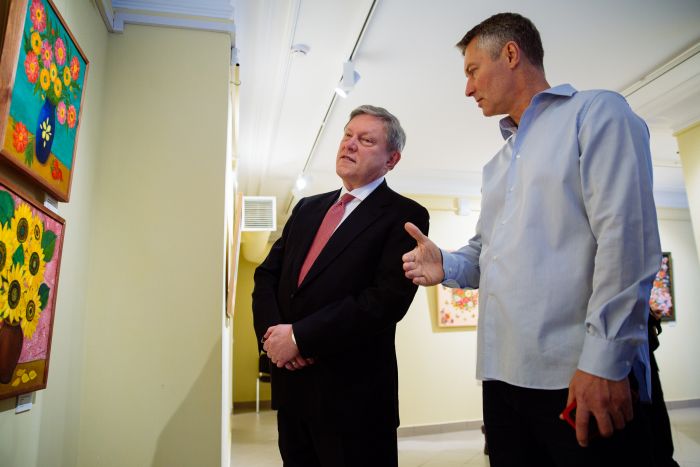 После делового завтрака Евгений Ройзман провел для Григория Явлинского экскурсию по Музею наивного искусства. Ройзман стал идейным вдохновителем этого музея, он уже много лет собирает работы уральских художников по всей области.