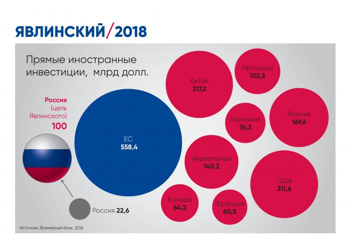 Политик считает, что государство должно отказаться от экзотических путей развития и мобилизационных планов экономики, взять на себя обязательства больше никогда не проводить политику, направленную на отъем собственности. Кроме того, новый президент должен ограничить концентрацию собственности в одних руках и не препятствовать долгосрочным инвестициям в российскую экономику. Григорий Явлинский поставил перед собой задачу обеспечить приток прямых иностранных инвестиций в Россию не менее 100 млрд долл. в год.
