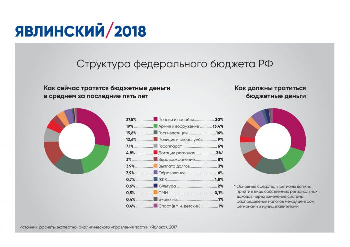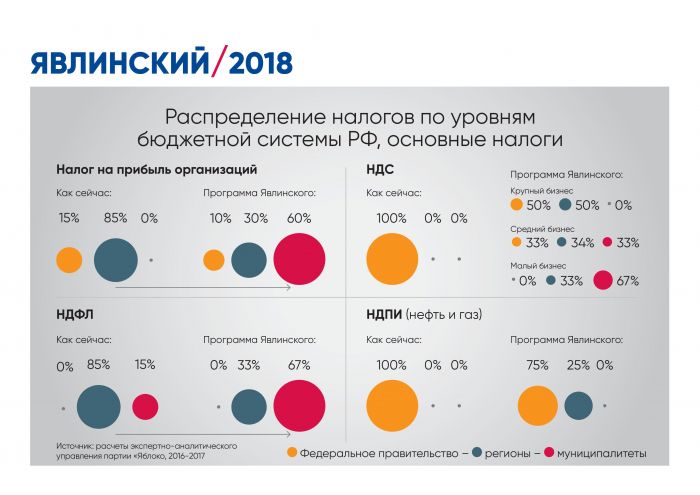 Кроме того, Григорий Явлинский предложил качественно иную налоговую политику, смысл которой – в перераспределении налоговых доходов от центра к регионам и муниципалитетам в равной пропорции. «Проводимая сейчас политика – это политика не федеративного, а унитарного государства с сильной авторитарной властью», – подчеркнул кандидат в президенты.