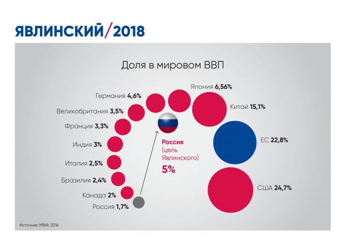 Григорий Явлинский назвал своей целью на посту президента сделать российскую экономику одной из крупнейших в мире и довести долю России в мировом ВВП с 1,7 до 5 процентов. По словам кандидата в президенты, это можно сделать, если реализовать его стратегию.