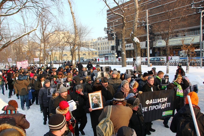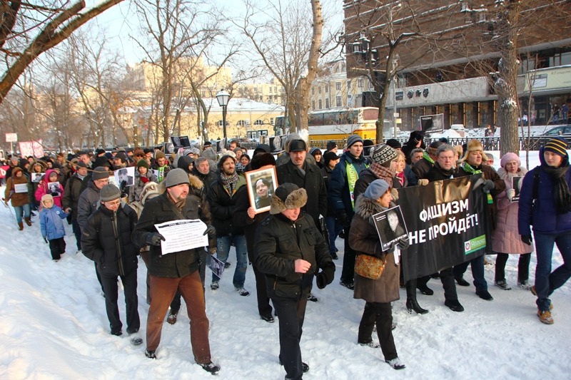 Party activists held a banner “Fascism will not go” and photographs of the killed Stanislav Markelov, Anastasia Baburova, Yury Schekochikhin, Farid Babayev, Anna Politkovskaya and Larissa Yudina.