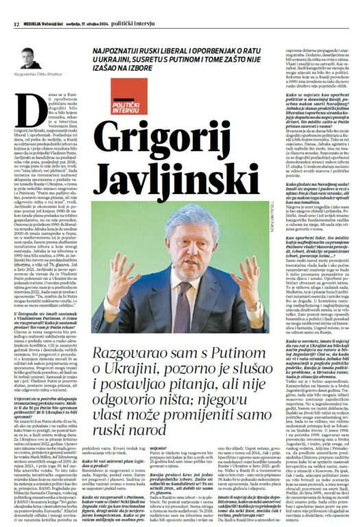 О том, почему ключевые политические фигуры в мире не готовы обсуждать прекращение огня в Украине, основатель российской демократической партии «Яблоко» Григорий Явлинский рассказал в интервью одной из самых популярных хорватских газет Vecernji list.