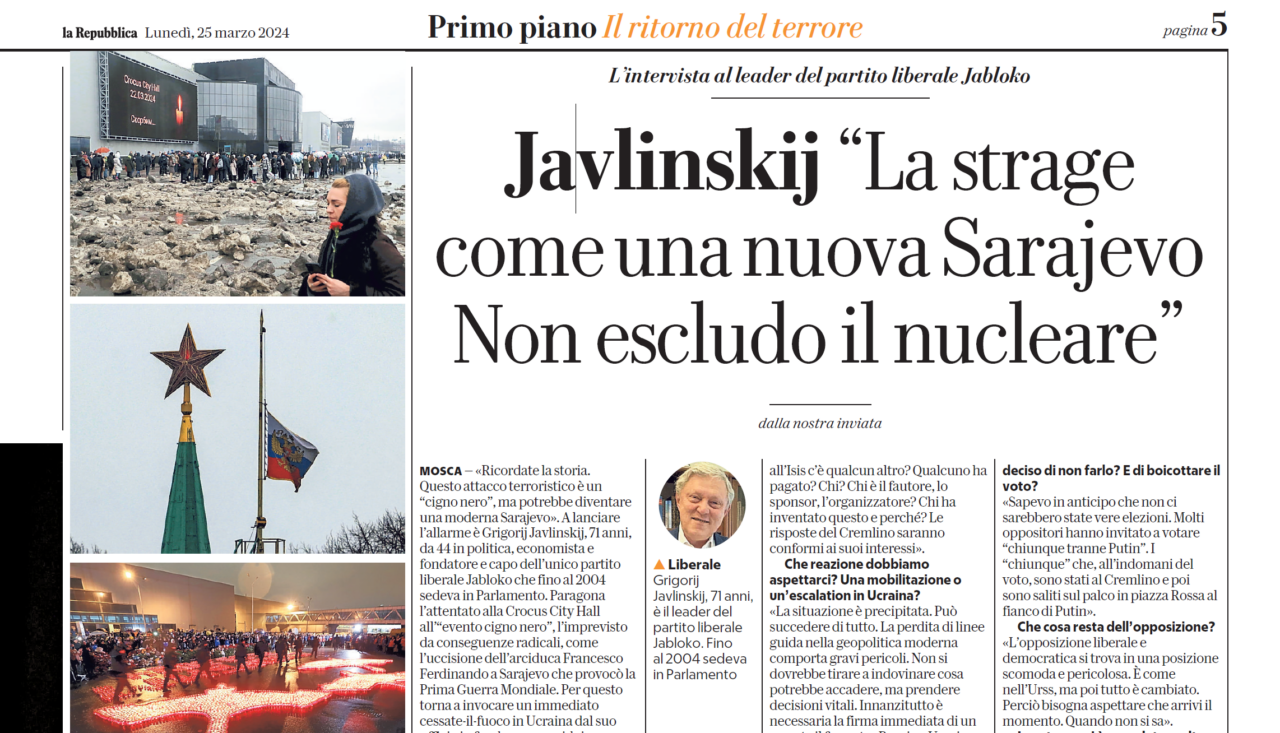 В интервью итальянской газете la Repubblica лидер партии «Яблоко» Григорий Явлинский сравнил теракт в «Крокус Сити Холле» с событиями, послужившими поводом к началу Первой мировой войны.