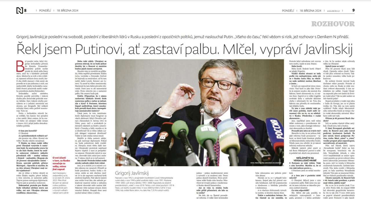 Григорий Явлинский — последний из остающихся в России на свободе политиков демократического толка. Явлинский — единственный из оппозиционных российских политиков, которого допустили в Кремль и которого согласился выслушать президент Путин. В интервью чешской газете Denik N Григорий Явлинский рассказал о том, почему необходимо немедленно прекратить огонь, какие ошибки допустил Запад в отношении России и чем опасен версальский синдром.