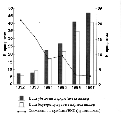 На рисунке 1 показана динамика прибылей и убытков, а также доля бартерных сделок в российской промышленности в период с 1992 по 1997 год. Обращает на себя внимание тот факт, что доля убыточных фирм возросла с примерно 7% в 1992 году до почти 50% в 1997 году. Эти показатели, конечно, включают и приватизированные фирмы. Эти фирмы не получают никаких субсидий от правительства. Вместо этого они просто накапливают задолженности по налогам и платежам. В следующей главе мы более подробно обсудим эту модифицированную форму погони за ренто-дотационными доходами, которая продолжает процветать, несмотря на якобы строгие бюджетные ограничения.