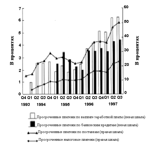 Интересно отметить, что задолженность по выплатам банковских кредитов была гораздо ниже (около 1% ВНП), и это просто отражает тот факт, что банки воздерживались от предоставления кредитов промышленным предприятиям еще даже до финансового краха осенью 1998 года. (Более 97% выданных банковских кредитов в России были краткосрочными, в основном на три месяца, для финансирования импортно-экспортных операций, а также оптовых и розничных торговых сделок.) Даже если мы отвлечемся от задолженности, накопленной фирмами друг перед другом, и сосредоточимся только на задолженности по платежам, причитающимся другим секторам экономики (задолженности по уплате налогов, задолженности по выплате заработной платы и задолженности по выплате банковских кредитов), то она составила более 60% денежной массы в 1997 году. Таким образом, снижение темпов инфляции, которое в стандартном случае, рассматриваемом в учебниках, должно положительно отражаться на совокупном спросе за счет увеличения реальной ценности денежной массы (реальный эффект баланса) в России имело гораздо меньшее положительное влияние, если имело его вообще, потому что оно одновременно с реальной ценностью денег также увеличивало и реальную стоимость долгов, накопленных предприятиями, снижая их эффективный спрос.