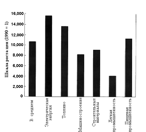 Рисунок 3. Рост цен производителей по отраслям промышленности, 1990-1995 гг. (1990 = 1). (Источник: расчеты автора, основанные на данных <Российского экономического ежегодника>, (1997).