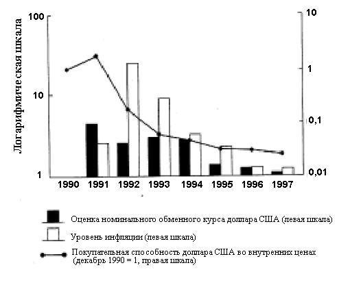 Рисунок 4. Оценка реального обменного курса рубля, 1991-1997 гг. (Источник: расчеты автора, основанные на данных <Российского экономического ежегодника> (1997), и официальных бюллетенях Центрального банка России).