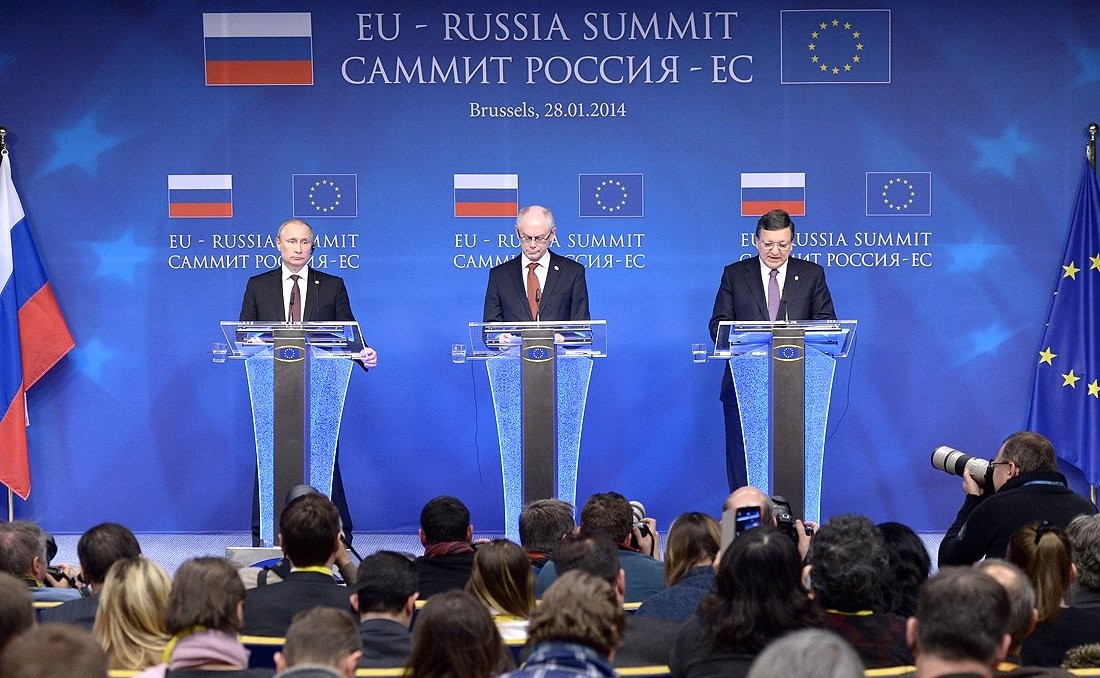 The Russian President Vladimir Putin, European Council President Herman Van Rompuy and European Commission President Jose Manuel Barroso at the joint news conference following the Russia-EU summit. Brussels, 28 January 2014 // PHOTO: Kremlin’s press office